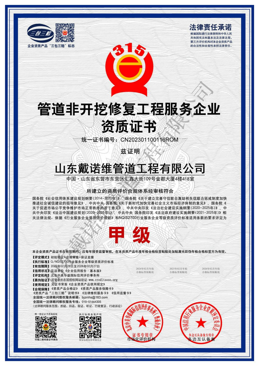 管道非開挖修復(fù)工程服務(wù)企業(yè)資質(zhì)證書