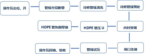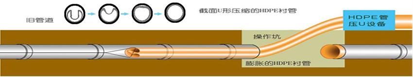 管道內(nèi)襯PE管修復是將外徑等于或略小于待修復管道內(nèi)徑的HDPE襯管,通過專用壓U設備,截面被壓變成雙層U形。在牽引力的作用下穿入待修復管道內(nèi)部。穿插到位后,利用壓力打開管腔,使之恢復成圓形,與外管道內(nèi)壁貼合,形成牢靠的復合管。